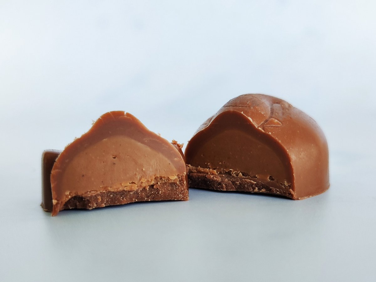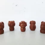Kleine vegan chocoladediertjes gevuld met praliné, zonder toegevoegde suiker.