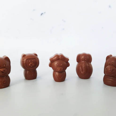 Ontmoet de Big 5 in hun meest onweerstaanbare vorm. Deze kleine, verfijnd gemaakte chocoladefiguurtjes zijn geïnspireerd op de iconische Big Five en gevuld met een zachte, rijke pralinévulling.