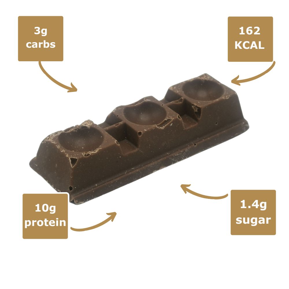 Ingredienten: cacaoboter, MELKeiwitten, cacaopasta, collageenhydrolysaat, HAZELNOOTpasta (7,5%), volle MELK in poedervorm, zoetstoffen: erythritol (E968) en steviolglycosiden uit Stevia (E960), SOJAstukjes (5%) (isolaat van SOJA-eiwit), fructo-oligosachariden, emulgator: zonnebloemlecithine (E322), vanilline.