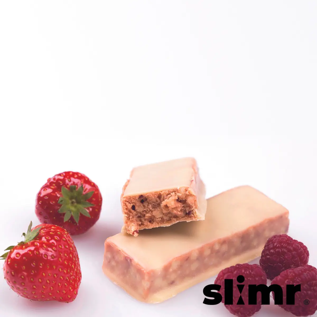 - nieuwe eiwitrijke reep met heerlijke aardbei en framboossmaak