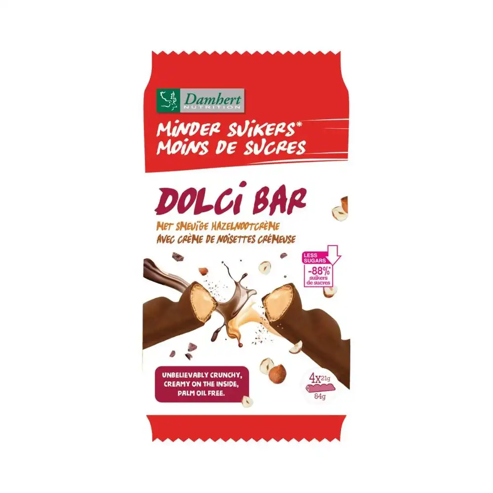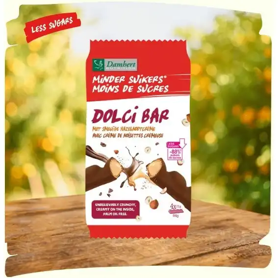 Geniet zonder schuldgevoel van de onweerstaanbare smaak van de Dolci Bar van Damhert. Deze heerlijke chocoladebar met smeuïge hazelnootcrème bevat 88% minder suiker, zonder in te leveren op smaak. De combinatie van een knapperige buitenkant en een romige vulling maakt elke hap een waar genot. Bovendien is de Dolci Bar vrij van palmolie, waardoor je bewuster kunt genieten. Perfect als tussendoortje, voor onderweg of gewoon als verwenmomentje.