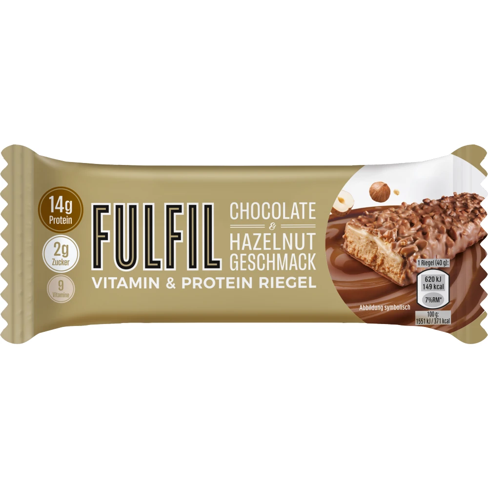 FULFIL Melkchocolade hazelnoot reep met 14 g eiwitten en 214 kcal.