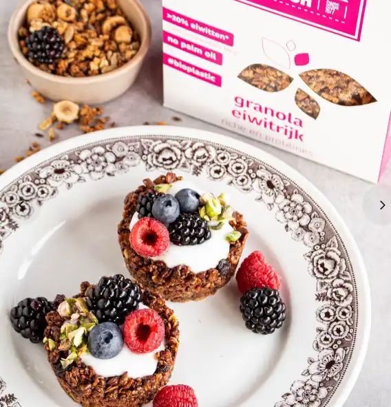 ⭐ Een eiwitrijk granola met meer dan 24 gram eiwit per 100 gram.