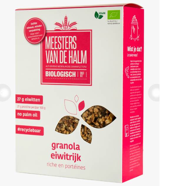 Een eiwitrijk granola met meer dan 20 gram eiwit per 100 gram.