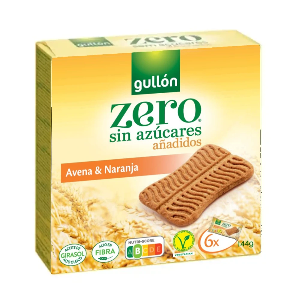 De Gullón Snack Havermout & Sinaasappel Zero zijn knapperige koekjes met een frisse toets van sinaasappel. Ze bevatten geen toegevoegde suikers, zijn rijk aan vezels en worden bereid met hoog-oleïne zonnebloemolie.