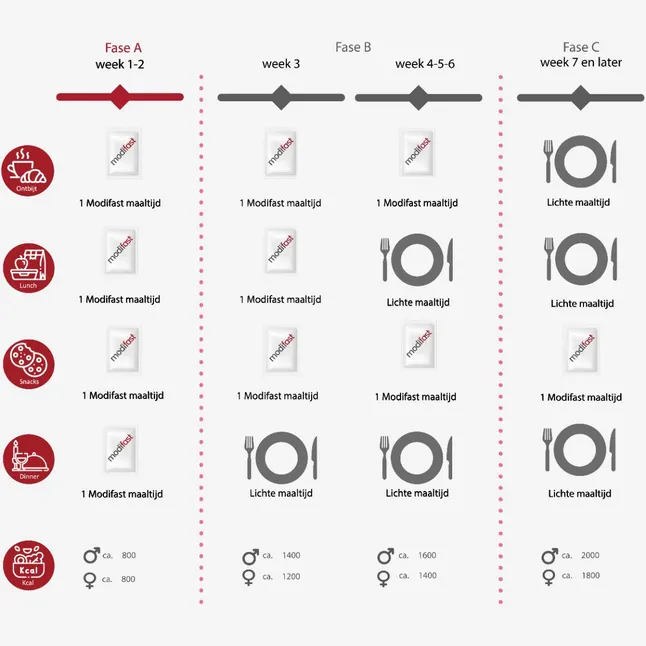 Modifast Intensive fase A beperkt je energie-inname tot slechts 800 kcal per dag. Tegelijkertijd krijg je alle vitaminen, spoorelementen, mineralen en eiwitten binnen die je lichaam nodig heeft.